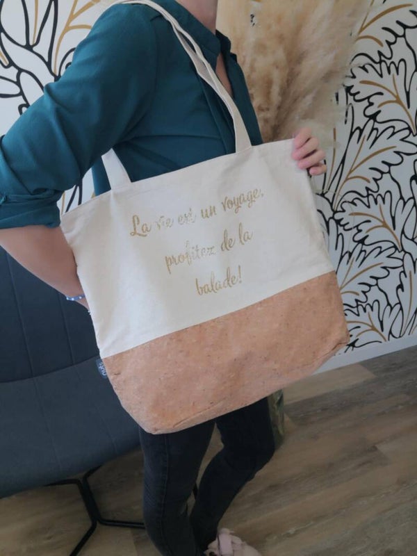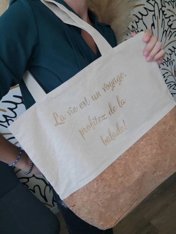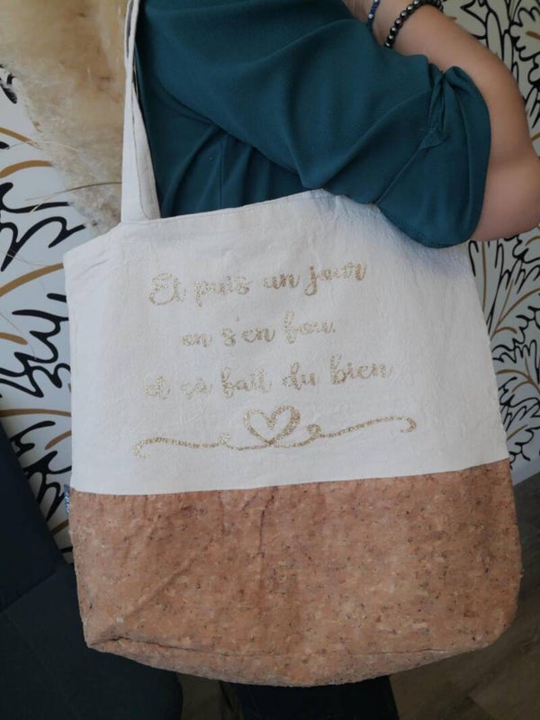 ce sac hyper sympa en toile de lin et liége se porte sur l'épaule.